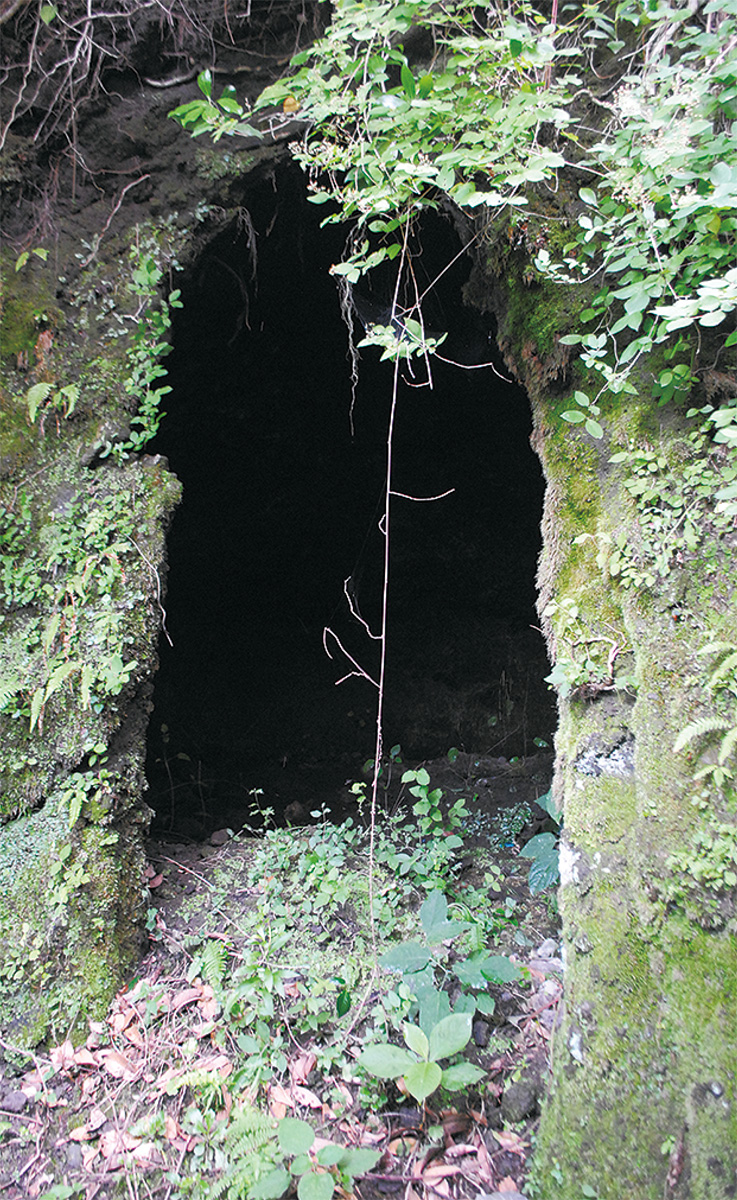 小田原市が73年に行った実態調査によれば、市内に残る地下壕跡は27カ所。この記録には記されていないが、宝泉寺(小田原市風祭)の本堂脇の岩壁にぽっかり空いた穴もその一つと考えられるものだ。棚を支える丸太の差込口とみられる壁の窪みは、資材を保管する地下壕に見られる特徴。戦争史の調査研究を行う「戦時下の小田原地方を記録する会」事務局長の井上弘さんは、「規模からしても地下壕だろう」と確信する。