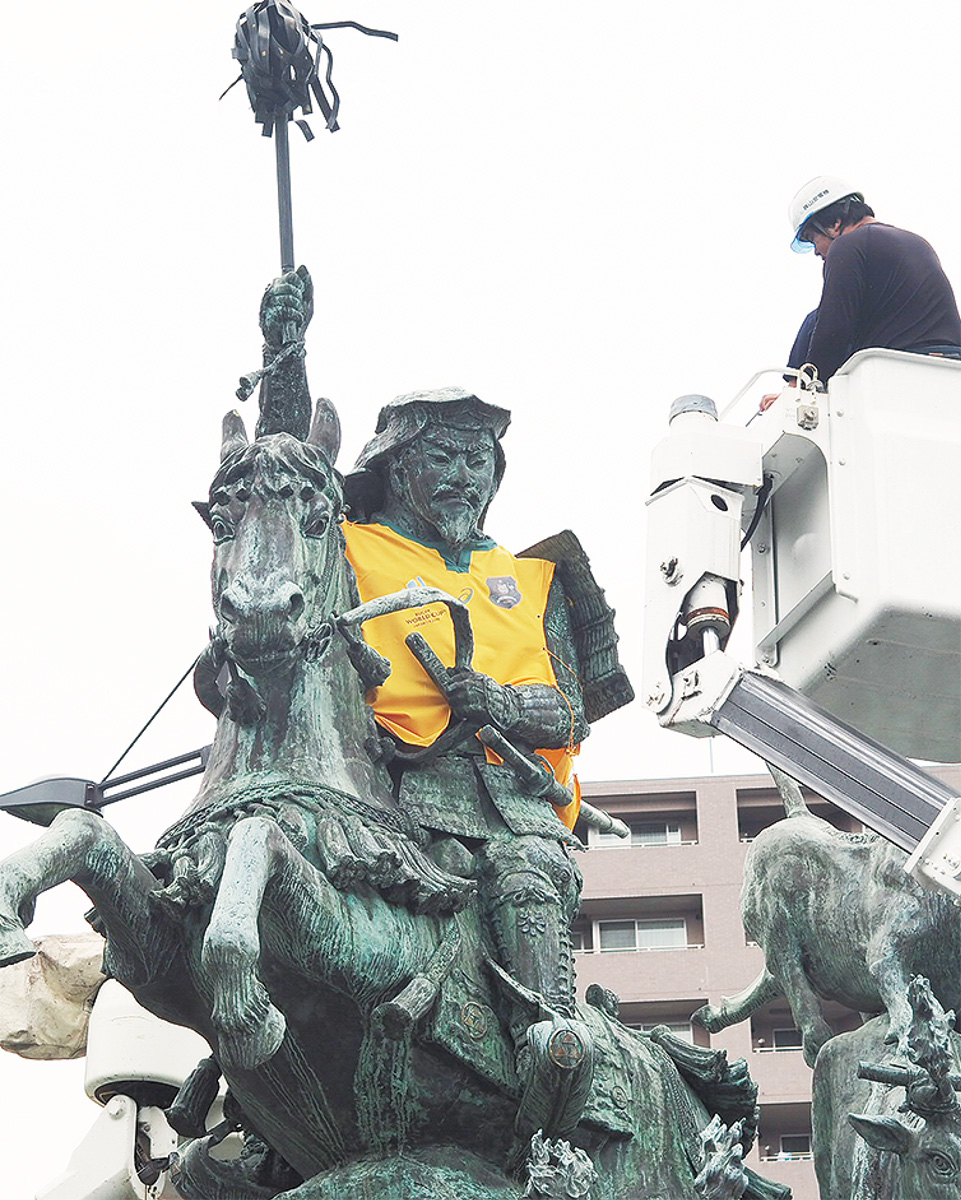 小田原で事前合宿を実施するラグビー豪州代表チーム「ワラビーズ」と「セブンズ」を歓迎する気持ちを込めて、7月16日に小田原駅西口ロータリーにある北条早雲公像に「ワラビーズ」のユニフォームを着せた。主催は小田原市ラグビー・オリパラ活性化委員会。