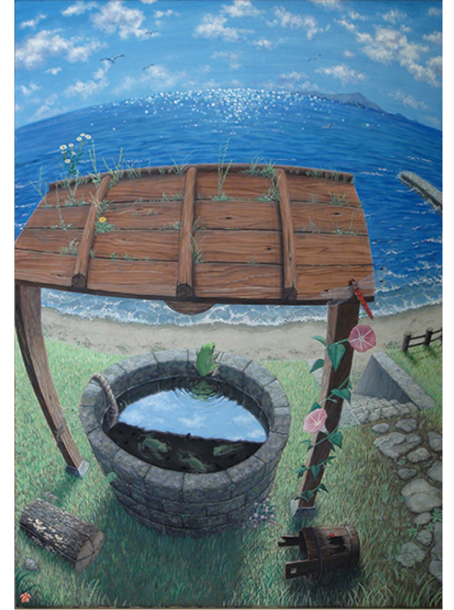 相洋高校美術部3年の岩本将太さんの作品、『井の中の蛙大海に出る』が出品される。作品は井戸から顔を出すカエルと輝く海を、魚眼レンズを使ったかのような構図に仕上げたのが特徴。