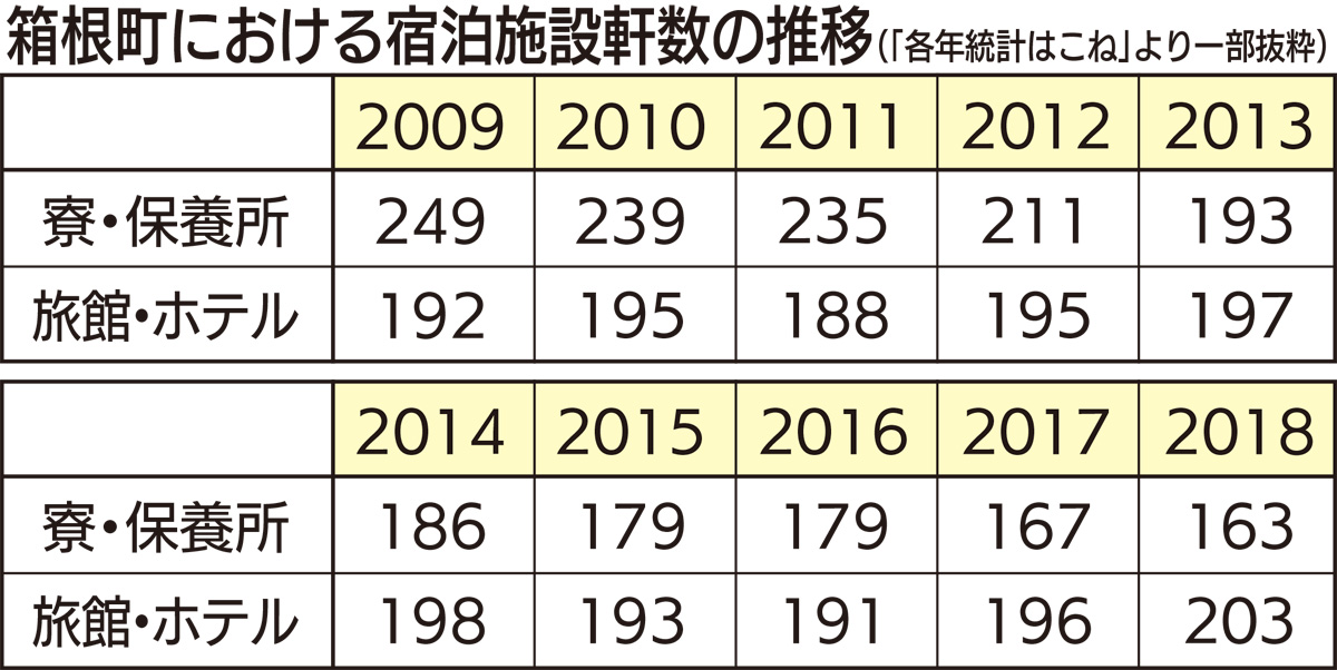 一方、「旅館・ホテル」の軒数はわずかながらも増加傾向。17年には前年を35万人上回る約470万人が箱根の地に宿泊するなど、観光地や保養地としてのニーズも依然として高い。こうした背景もあり、保養所だった施設が今回のケースのように、リノベーションして再活用される例が主流になっているという。
