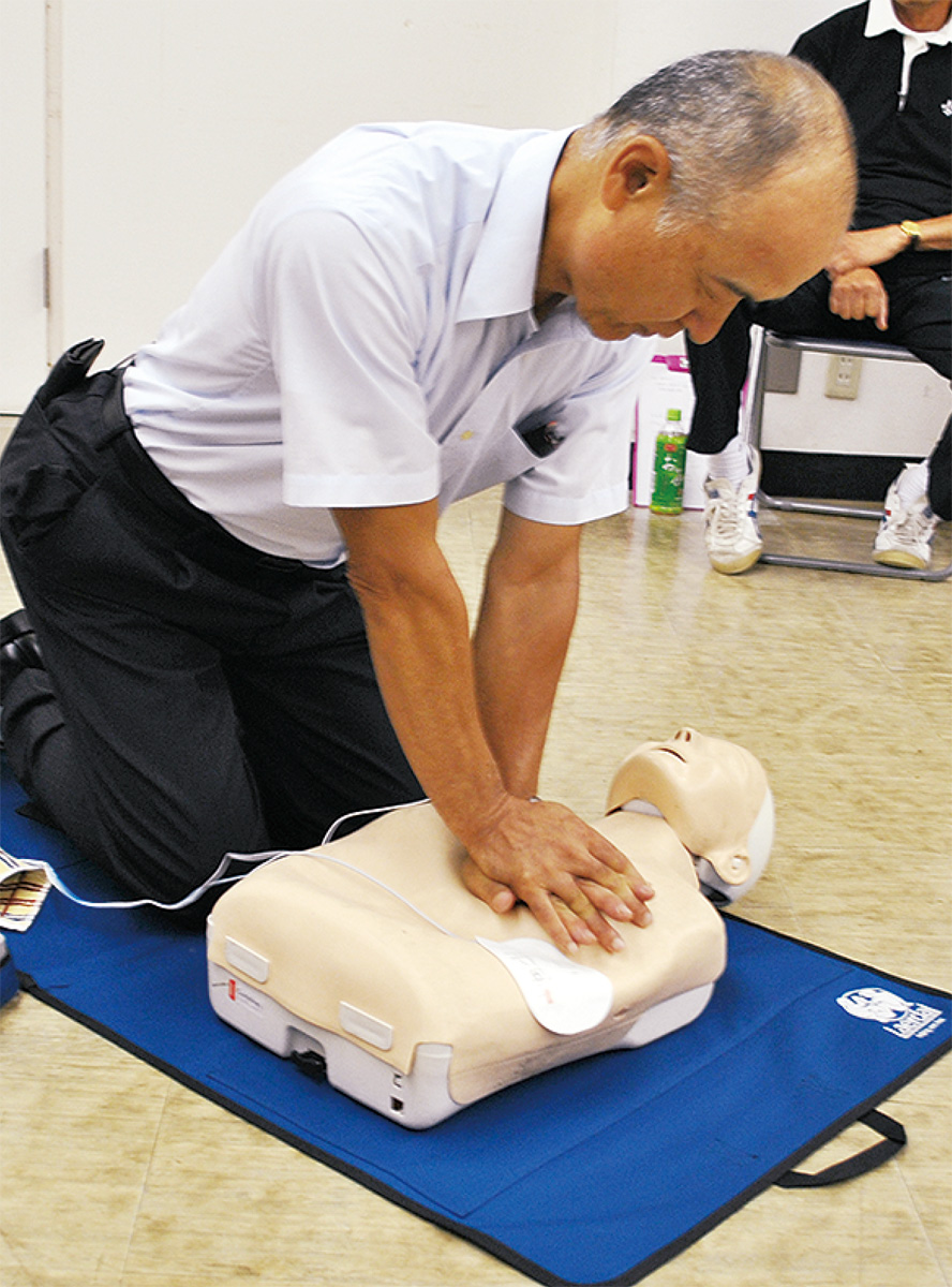 講師に招いた市消防署員が、意識を失っている人を発見した場合の呼び掛けから心臓マッサージ、人工呼吸、AEDの使い方の見本を見せてから参加者が実践。緊張して手順を飛ばしてしまう人もいたが、一つずつ指導を受けて心肺蘇生法やAEDの操作を体験した。
