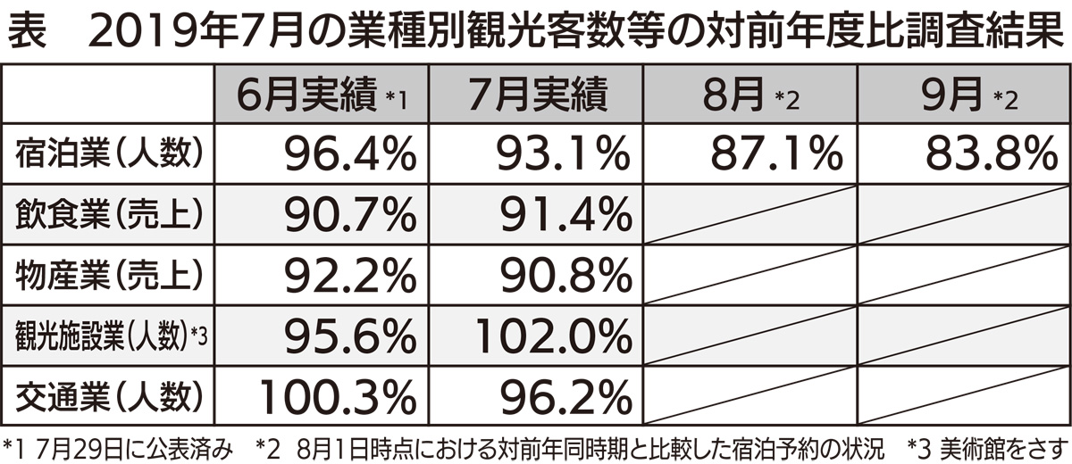 8・9月の宿泊予約状況は、8月1日時点で前年比90%以下。数値からは今後の見通しも明るくないと思われるが、同じく噴火警戒レベルが引き上げられた4年前の数値と比較すると減少幅は小さい。その背景について、同課では「前回は『噴火警戒レベル』の制定以降、全国で初めて適用された事象だったこと」をあげる。その後、他の火山活動でも適用されるようになり、「今はレベルに対する知識が深まっているのでは」と話し、今回の減少についても「立ち入り規制がかかる地域の限定的なもので、深刻な状況ではない」としている。