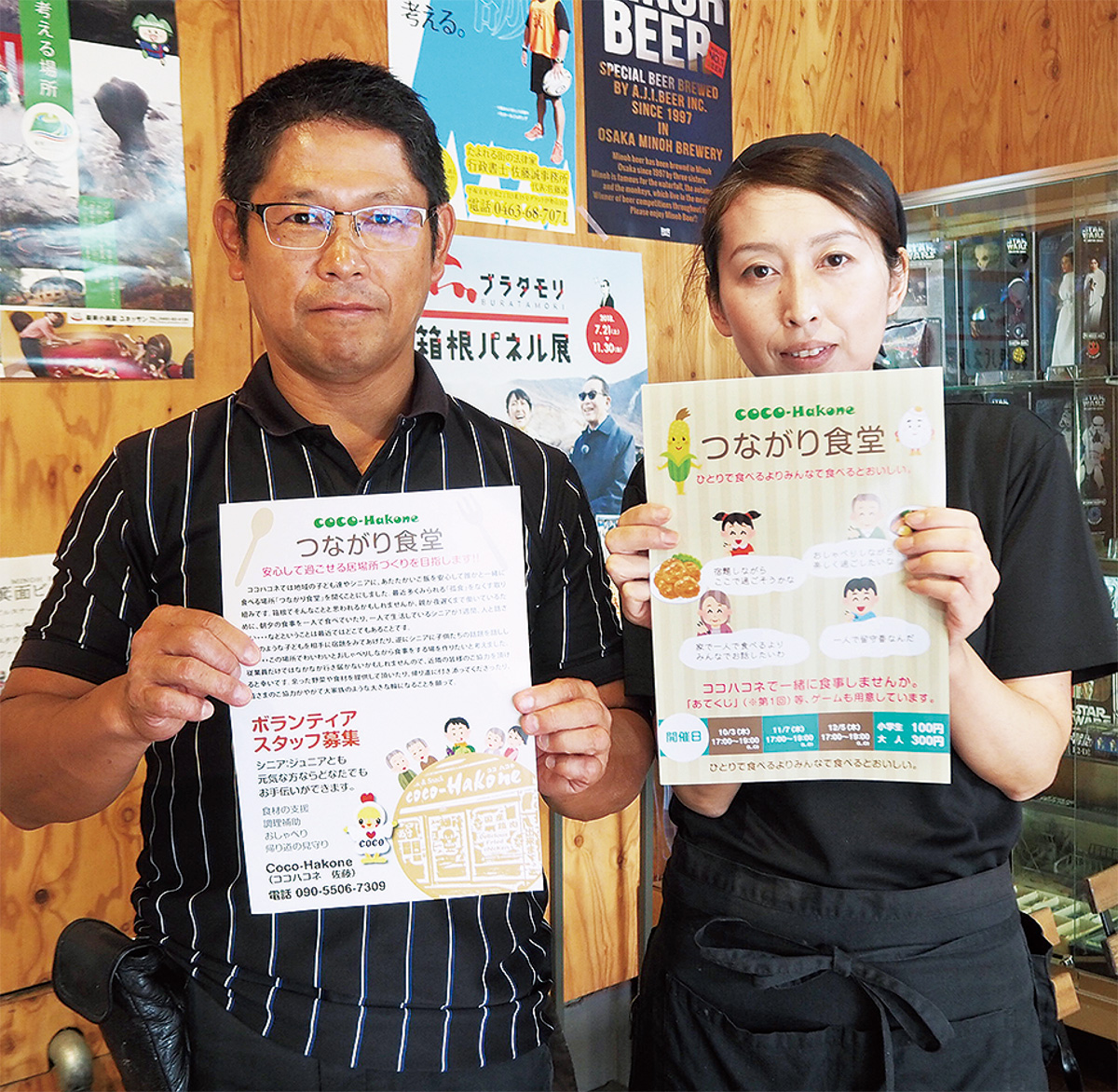 運営するのは(株)cocoroの代表を務める佐藤誠さん(平塚市在住・53)。佐藤さんは2009年にカレー専門店「箱根かれー心」、15年よりから揚げ専門店「ココハコネ」の2店舗を町内で経営している。同町は過疎地域ではないものの、人口減少が著しい地域。小学生2人の父でもある佐藤さんは「観光地なので親が夜遅くまで働いており、朝夕のご飯を子どもひとりで食べている家庭もあると聞いた。また高齢者のみの世帯も多い。お互いに交流でき、安心して過ごせる場所を提供できないか」と店舗を開放した食堂を企画した。