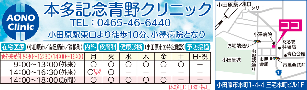 小田原駅東口徒歩10分、老舗だるま料理店向かい・小澤病院隣に昨秋開院した本多記念青野クリニック(青野治朗院長)。かつて間中病院で長きにわたり内科を担当していた本多正医師の「寄り添う医療」を受け継いで、外来と訪問診療の2本柱で地域医療の一端を担っている。
