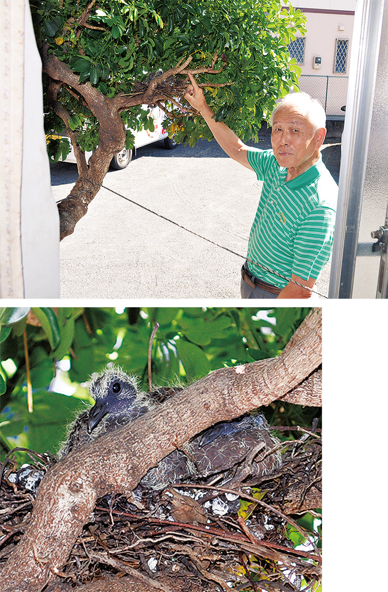 実は、この木で鳩がヒナを育てるのは6月に続いて今年2回目。知人に、鳩は1年に2回卵を産むと聞いていて心待ちにしていたという。「今度も、無事に巣立ってもらいたいね」と愛おしそうにヒナを見つめた。(※10月8日、2羽とも巣立った)