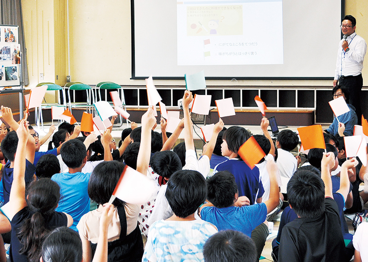 小学生の認知症に関する理解度を高めようと国府津小学校で9月30日、「認知症サポーター養成講座」が行われ、4年生約90人が参加した。