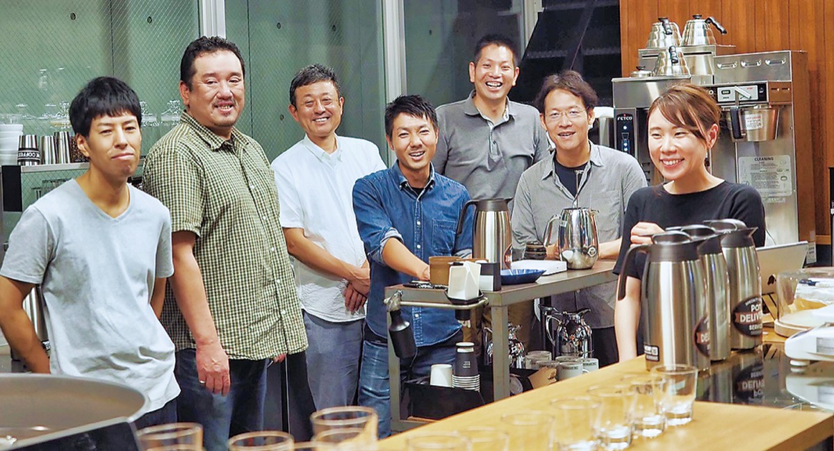 小田原市蓮正寺にあるひな珈琲の店主・池上直樹さん=写真左から3番目=が9月に行われた焙煎技術を競う「ローストマスターズチームチャレンジ」に、関東Bチームの一員として挑み、準優勝を果たした。