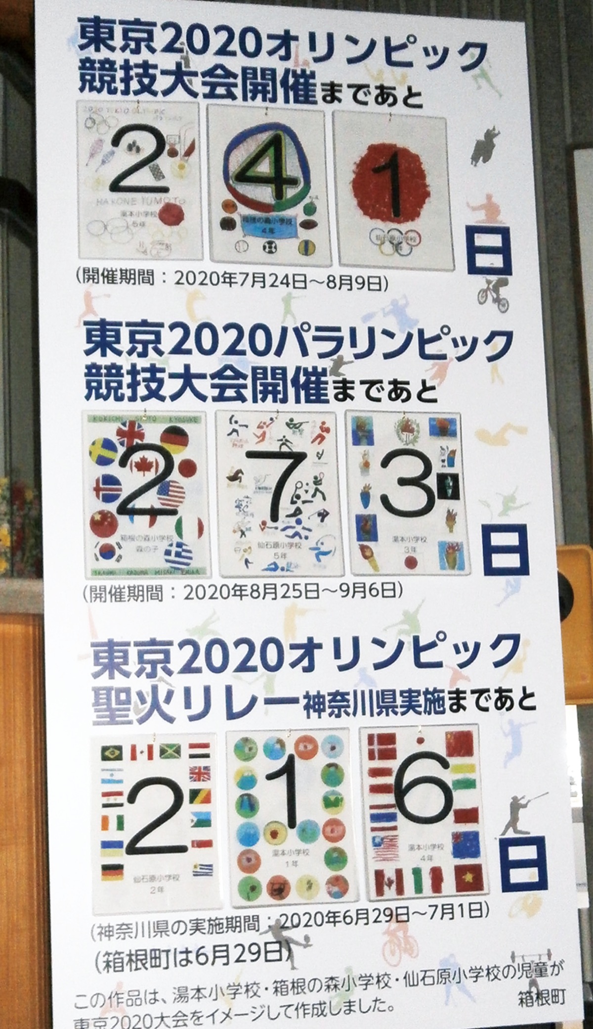 数字の周りには、野球やテニス、水泳等各種スポーツのシルエットや各国の国旗など色鮮かに描かれている。これらの絵は、大会への興味や理解を深めるきっかけになればと、湯本、箱根の森、仙石原の各小学校の協力を得て、1〜6年生の児童が描いた。同町企画課の担当者は「エリトリア国、ブータン王国、ミャンマー連邦共和国のホストタウンとして、大会を盛り上げていきたい」と話した。