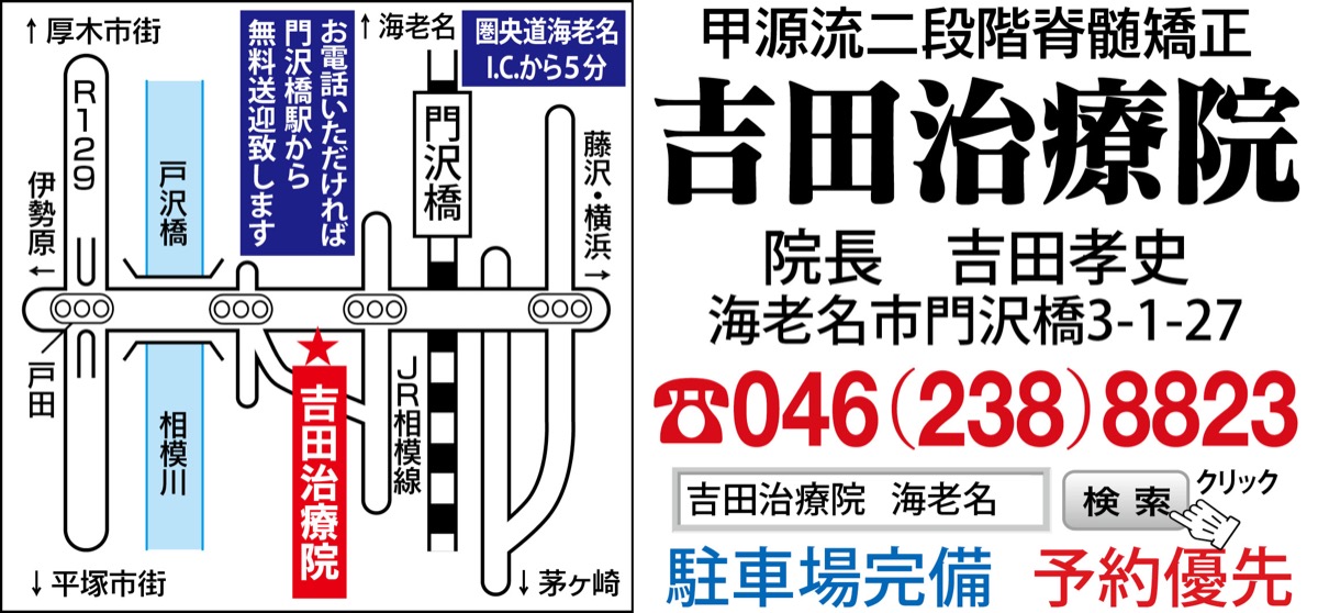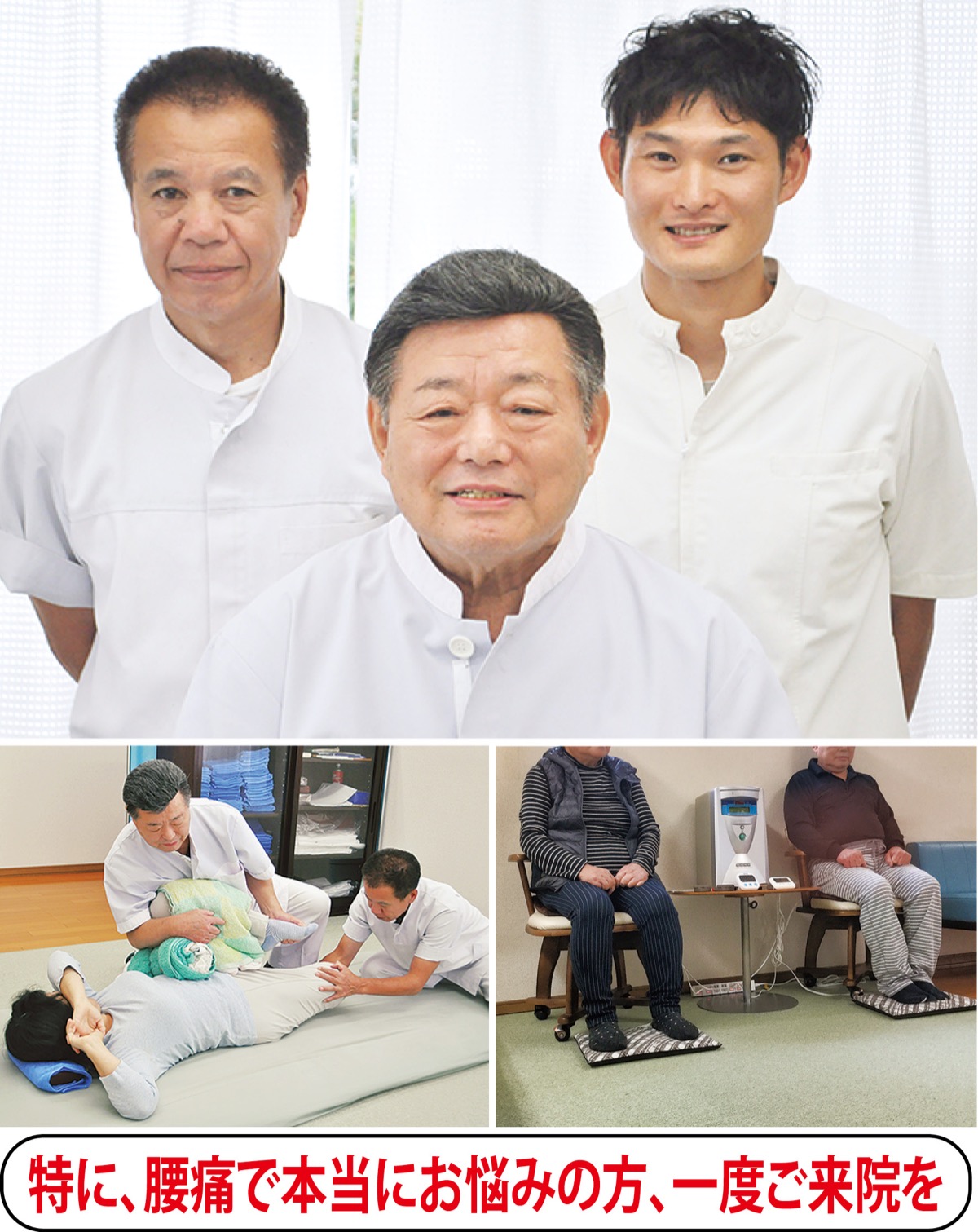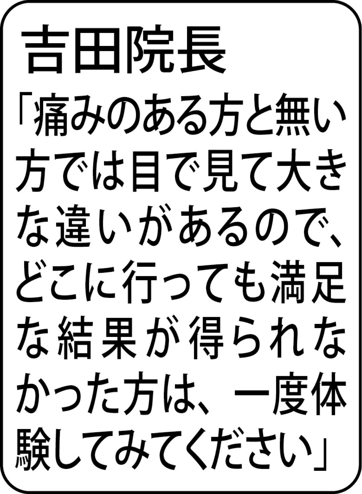 吉田院長は「特に腰痛関係には絶対の自信を持っています」と話す。その証拠に「お帰りの際に腰椎に痛みが残っていたら料金は頂きません」とキッパリ。来訪者からは「どこに行っても症状が改善せず、ワラをもつかむ思いで来たが、驚くほど楽になった」といった声があり、帰る時は皆笑顔に。施術は1回25〜35分と安全で、施術後のアフターフォローや自己管理法指導なども手厚い。相談無料。「まずはお電話下さい」。