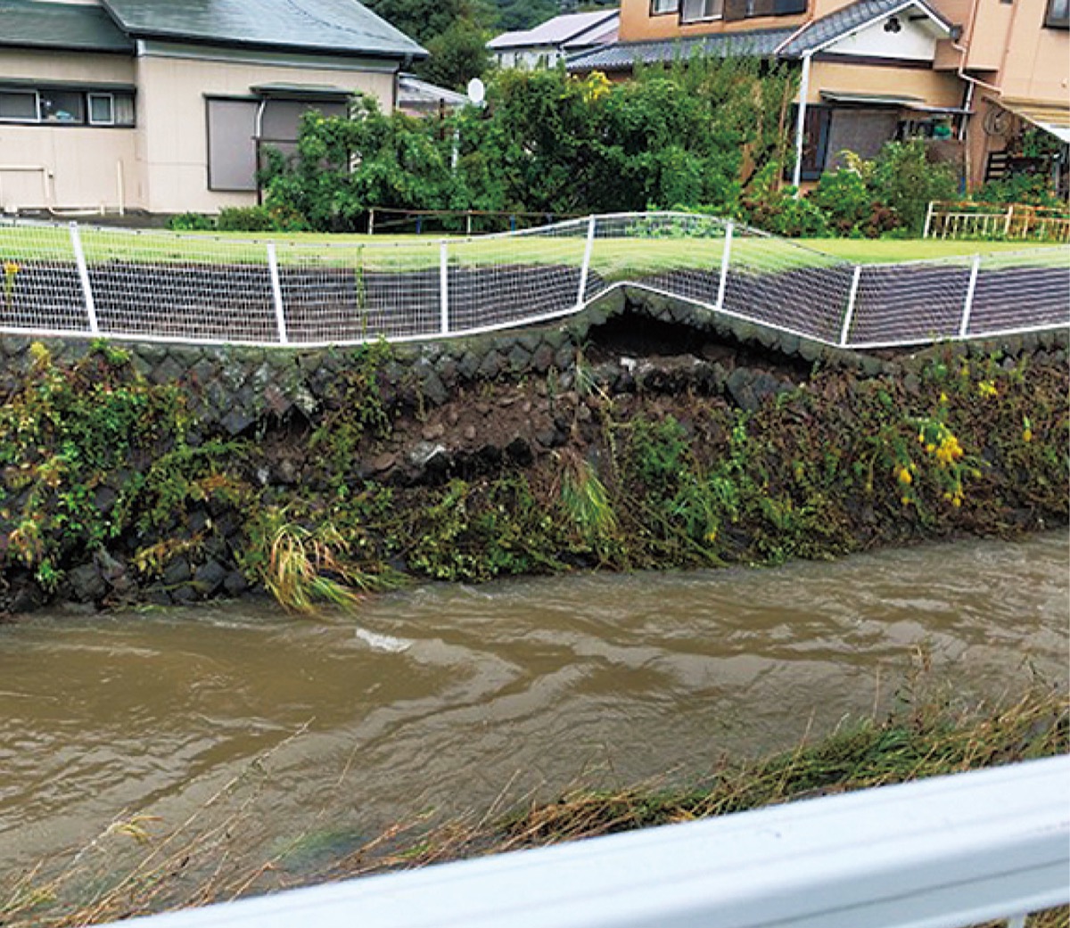 被害に遭ったのは、市内国府津の「ユーコープ国府津店」そばの護岸。同河川を管轄する県小田原土木事務所によると、護岸は全長約40mにわたり崩落。被災箇所には無数の大型土のうが積まれ、ブルーシートで被うなど応急的な措置が講じられているが、川沿いの土手は現在も一部通行止めが続いている。