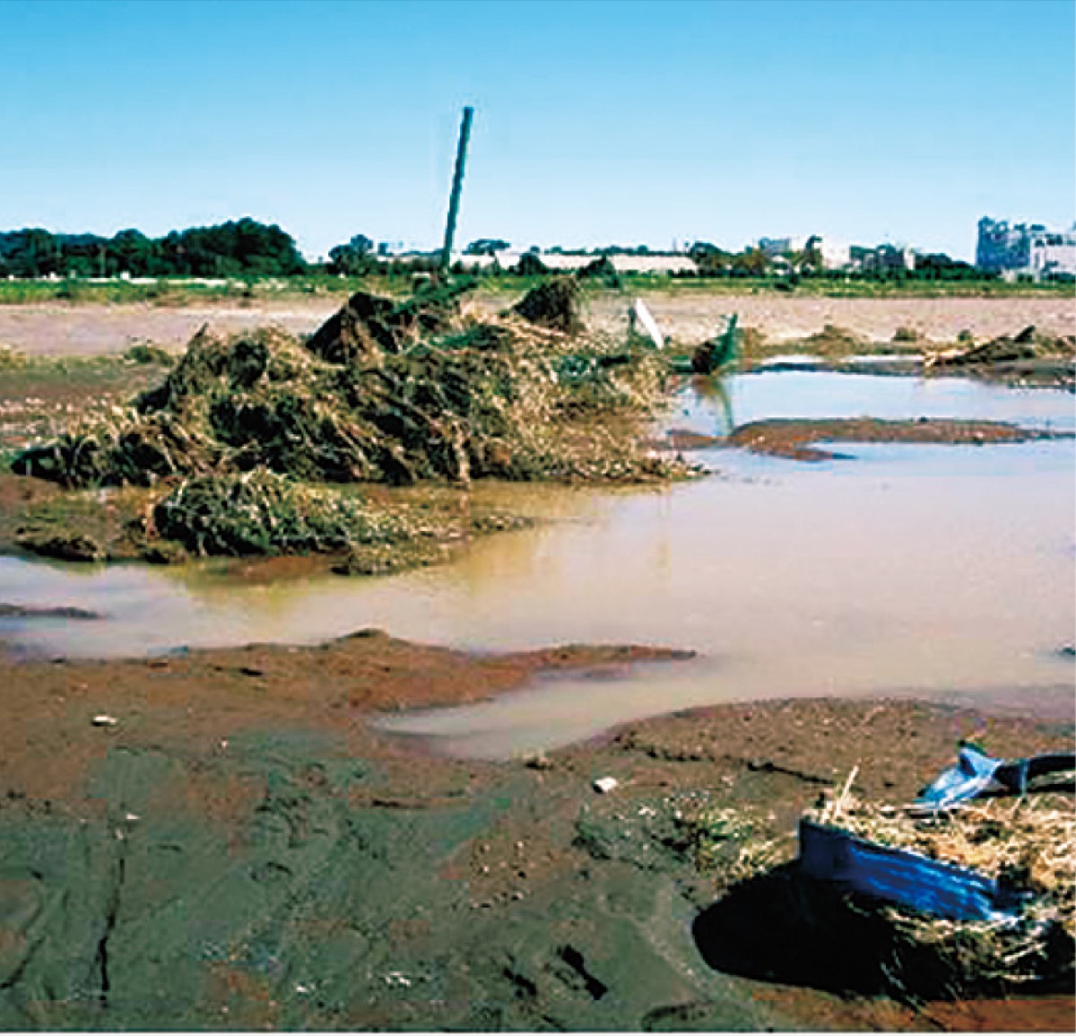 同広場ではグラウンドの表土が流され、地面がえぐれたほか、大木や岩、握り拳大の石などが流れ着き、利用できない状態が続いている。