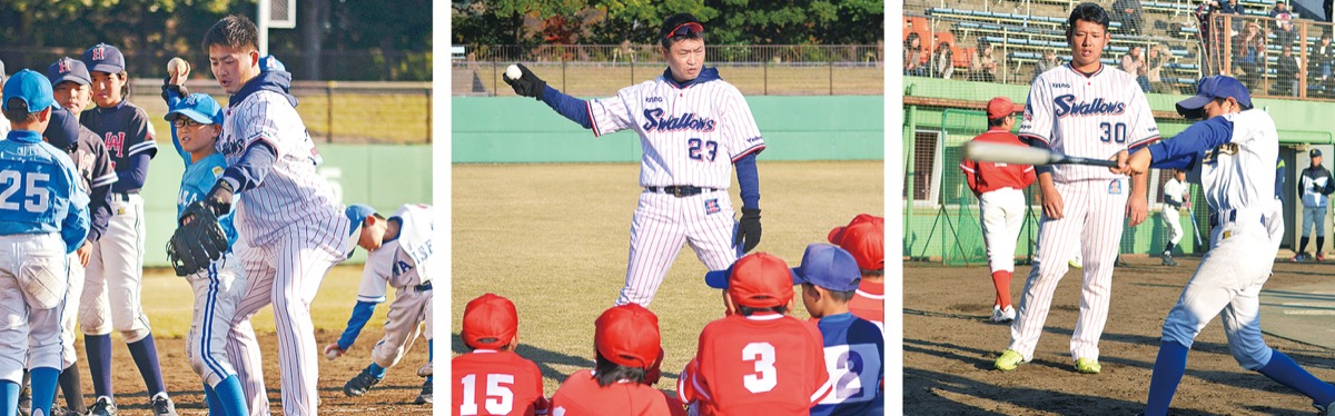 東京ヤクルトスワローズの現役選手による少年野球教室が12月8日に小田原球場で開かれ、県西の小学生野球10チーム、総勢280人が指導を受けた。