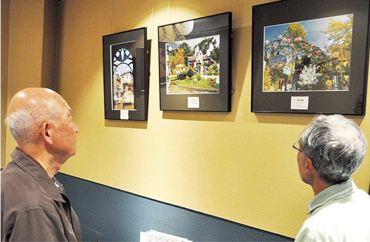展示しているのは、渋谷さんの教室に通う生徒有志「魚がしの会」の6人の作品。11月に箱根ガラスの森美術館(仙石原)で撮影した紅葉で色づく庭園やきらびやかなガラスのオブジェなどが写っている。今後、季節ごとに作品を入れ替える計画もある。女将の出口栄子さん(68)は「きれいな写真を見て、お客様が箱根に行くきっかけになれば」と話している。