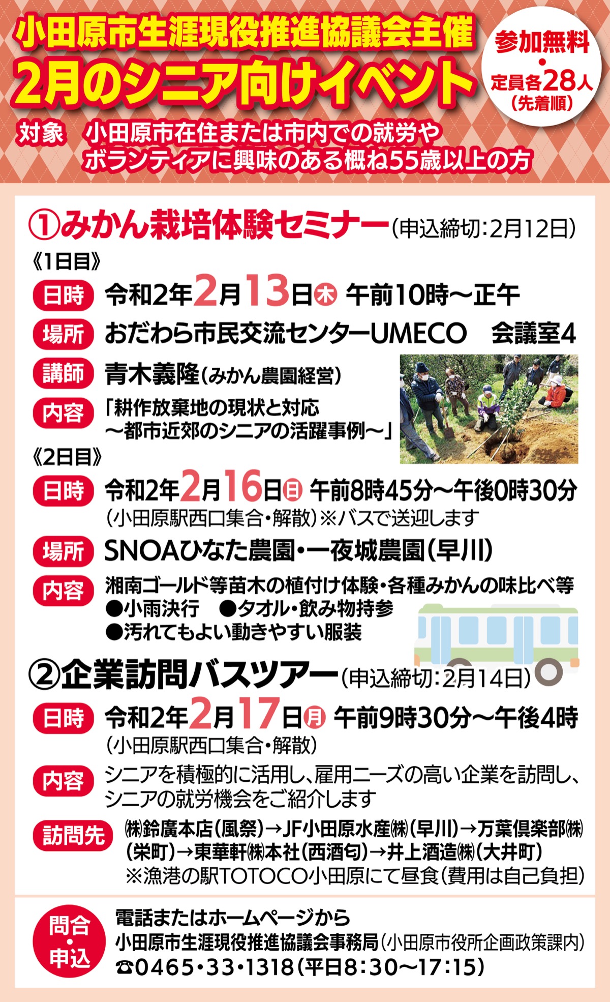 2月17日(月)には、「シニアのための企業訪問バスツアー」を開催。(株)鈴廣本店、JF小田原水産(株)、万葉倶楽部(株)、東華軒(株)本社、井上酒造(株)の5社をバスで巡るツアーで、いずれも雇用ニーズの高い企業だ。
