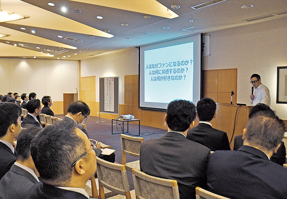 同塾メンバーや関係者約80人が出席したこの日。第1部として、企業がイメージを確立させるために取り組むべき商品やサービス周知を学ぶ講演会が行われた。