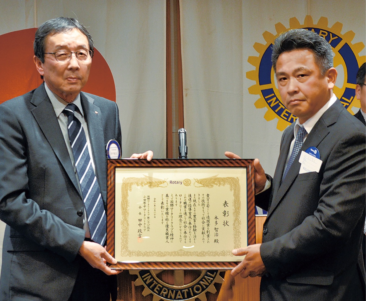 奉仕団体・小田原中ロータリークラブ(田中政吉会長)が毎年選定している優良職業人表彰に、小田原市内で造園業を営む本多智治さん(株式会社本多造園代表取締役・49)が選ばれた。表彰は、職業を通して社会に奉仕するという国際ロータリーの理念に基づき、同クラブが独自に行っているもの。