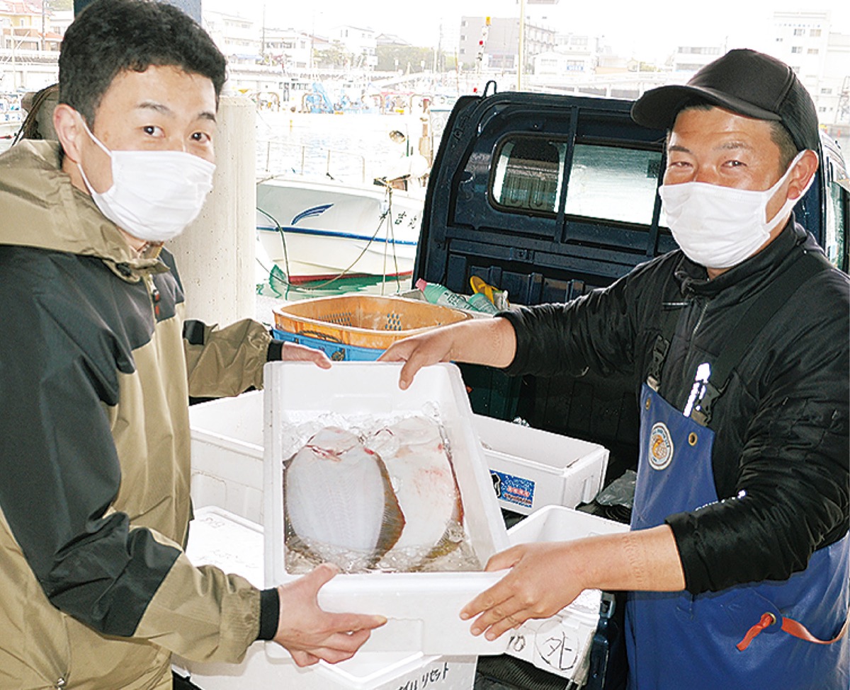 地元漁師の鈴木大助さん(38・小田原市本町)が小田原漁港で4月20日、飲食店経営者らに自身が操る漁船「藤八丸」で獲ったヒラメを無償で提供した。