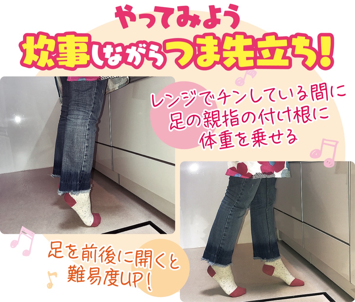 「掃除、炊事、洗濯、買物など毎日の家事動作の中に簡単な運動を取り入れてみましょう」と初鹿さん。例えば、「炊事しながらつま先立ち」。レンジでチンしている間や食器を拭いている間に、足の親指の付け根に体重を乗せるだけ。第二の心臓と言われる、ふくらはぎの運動になり、姿勢の改善や循環状態の改善、こむら返りの予防にも効果的だという。