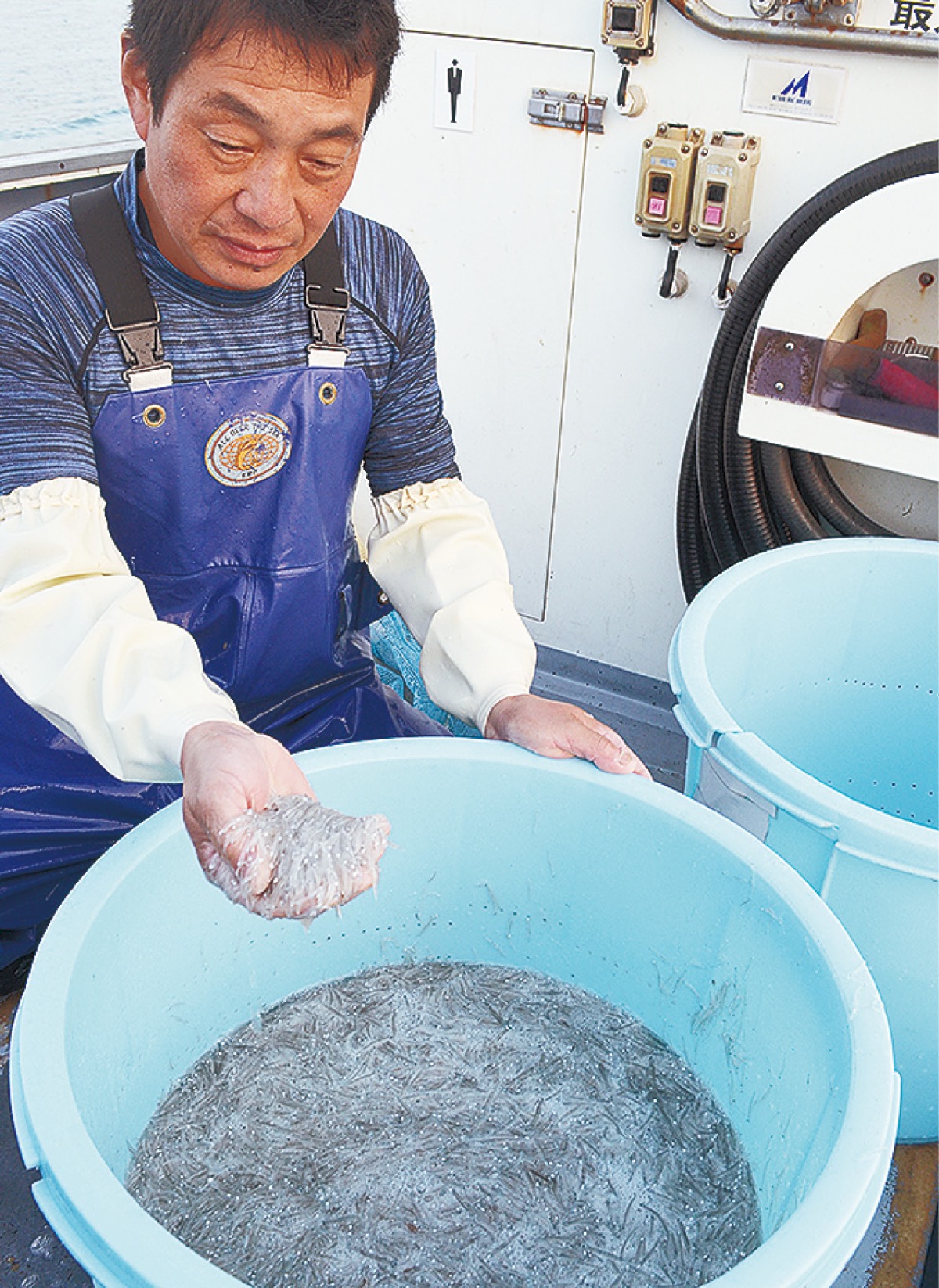 朝4時には出港し、勘を頼りに沖に向かう和田さん。魚群探査機で群れが見つかれば、網で囲み一気に引き揚げる。シラスを船上で氷水に漬け、6時ごろに帰港。5月中旬の漁では約40kgを収穫し、水揚げ直後から賑やかなセリが行われた。