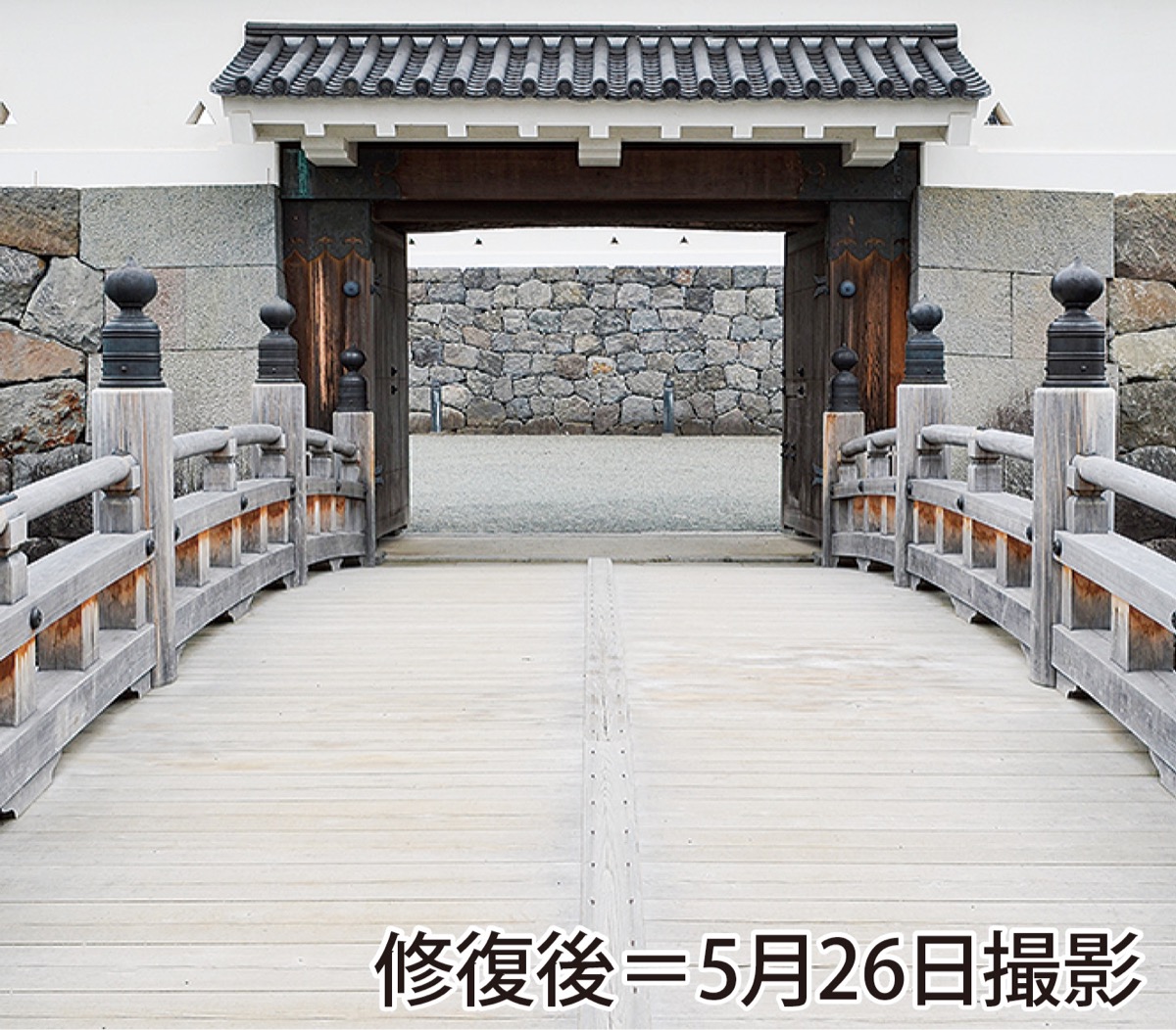 3月に何者かによって油がまかれる被害にあった小田原市城址公園内の住吉橋の修復作業が、5月22日から数日を掛けて行われた。