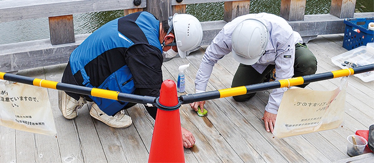 作業では職人が、橋の欄干や床板に染み込んでいる油を中性洗剤とスポンジで丁寧にふき取っていった。続いて、周辺の木材との色の違いを目立たなくさせる技法「古色」として、香炉灰や硝煙などを調合した粉末を修復した部分になじませていった。今後も、状態を見ながら必要に応じて手を加えていくという。