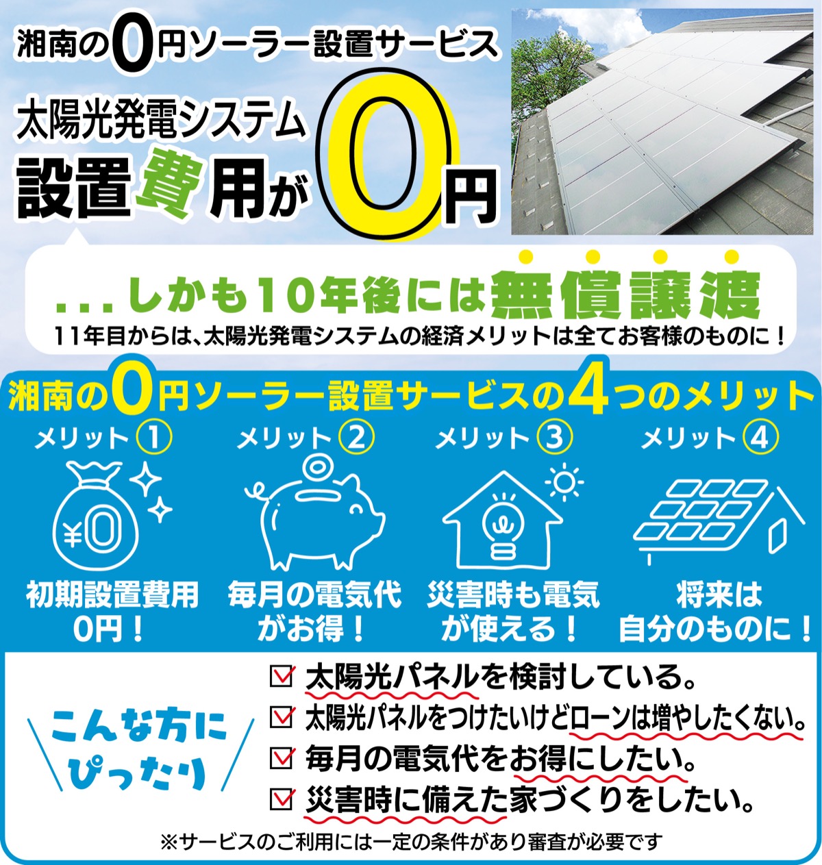湘南電力(株)(小田原市)が提案するその名も『0円ソーラー設置サービス』。神奈川県のソーラーバンクシステムに登録された「0円ソーラープラン」のひとつだ。