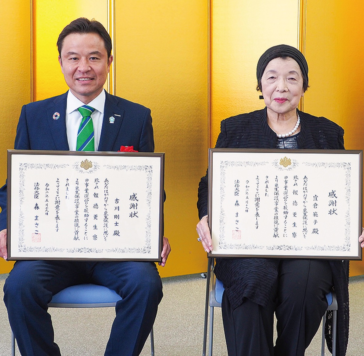 小田原市内でエネルギー関連事業を行う(株)古川の古川剛士代表取締役(46)と窪倉医院事務長で報徳更生寮理事を務める窪倉範子さん(86)が長年の報徳更生寮の事業運営への貢献に対し、森まさこ法務大臣から感謝状が贈られた。6月5日、横浜保護観察所小田原駐在官事務所(小田原青色申告会内)で伝達式が行われた。