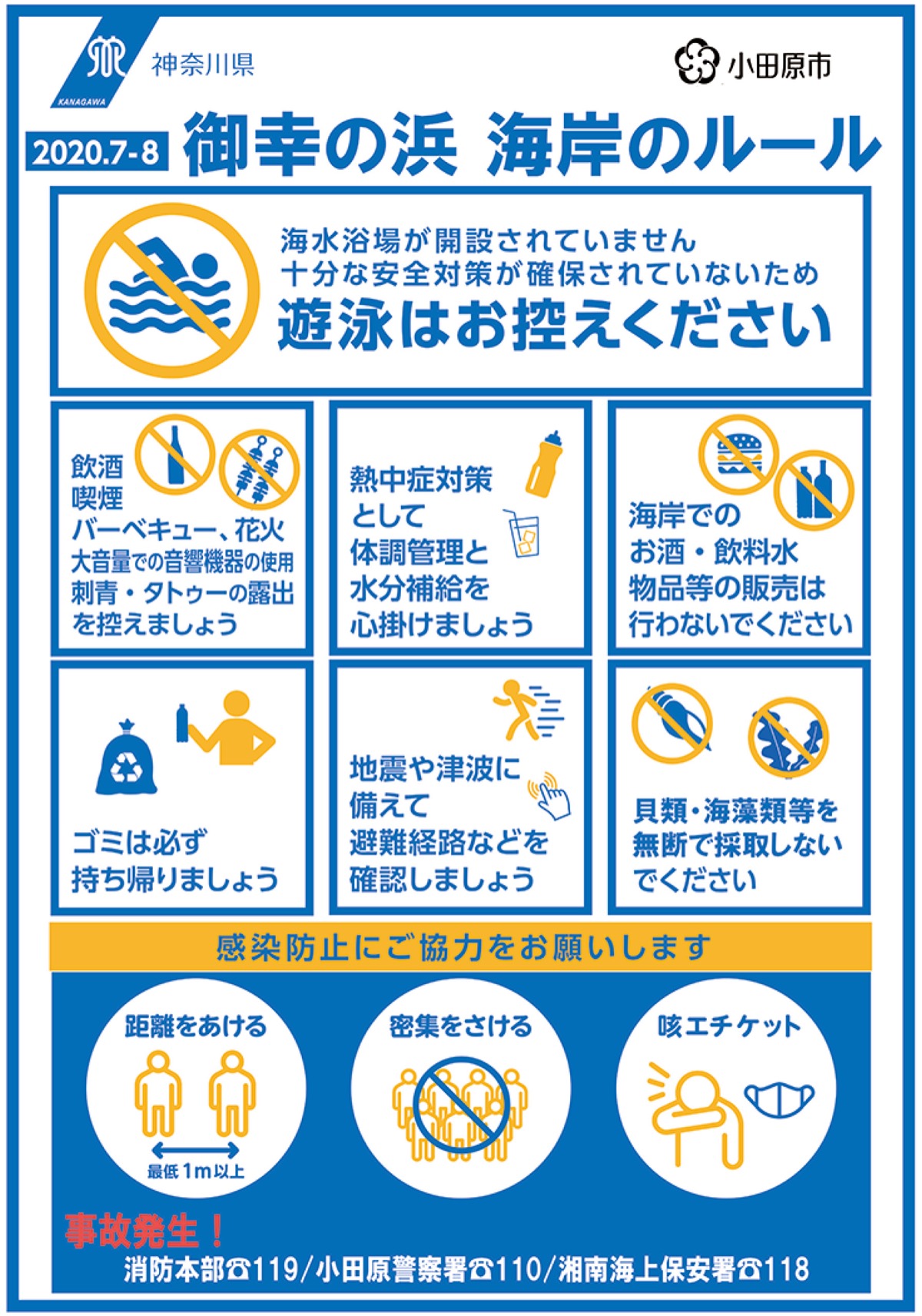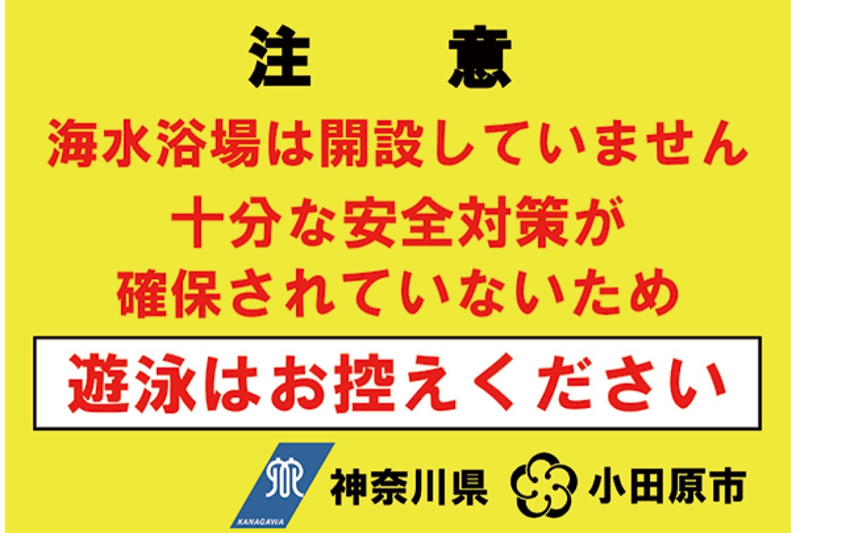 新型コロナウイルス感染拡大防止の観点から今夏の海水浴場の開設中止を決めた小田原市(御幸の浜・江之浦海水浴場)・湯河原町(湯河原海水浴場)・真鶴町(岩海水浴場)は、各海水浴場に海岸ルールの順守や遊泳を控えるチラシを掲示し自粛を呼び掛ける。
