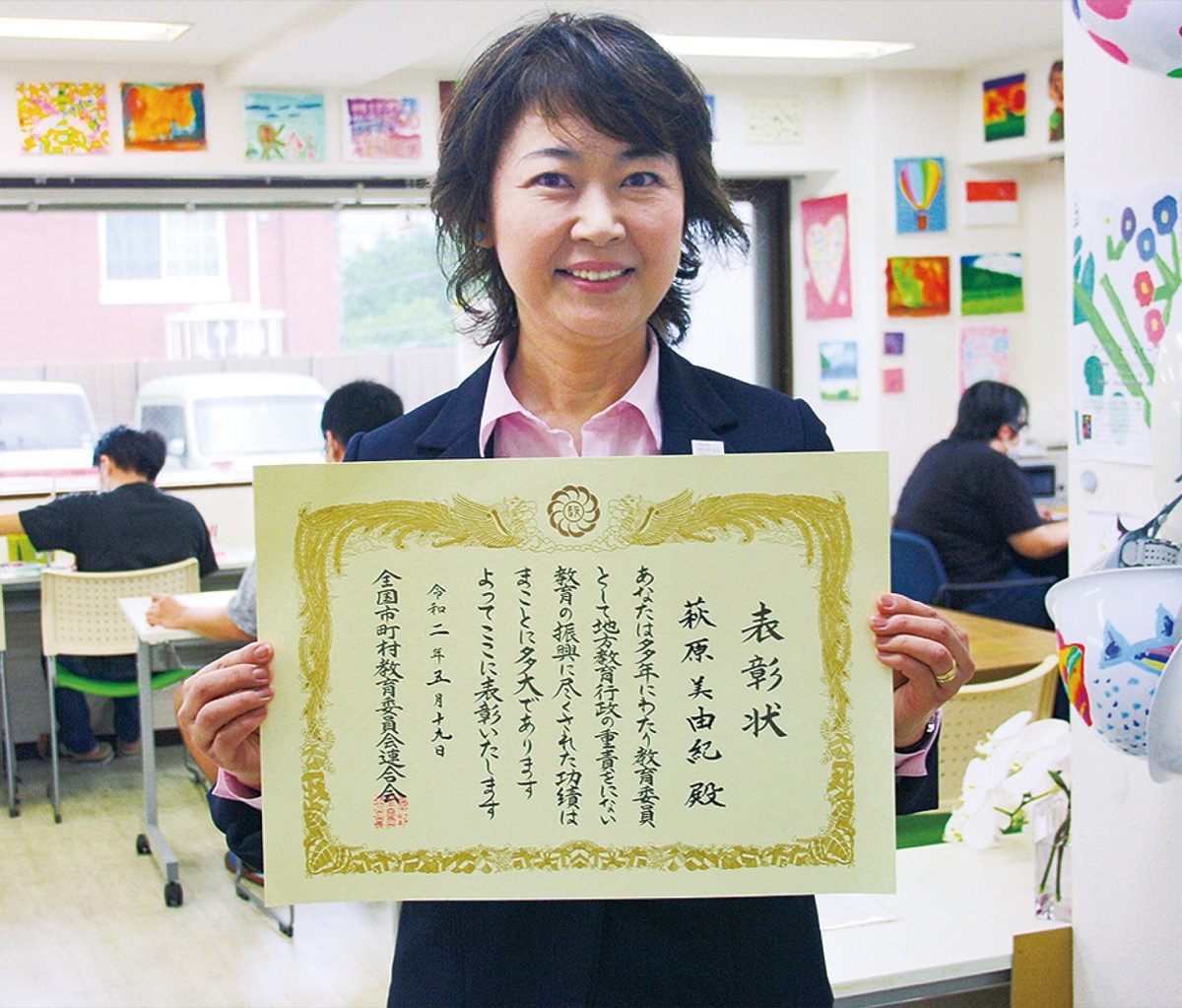 2期8年にわたり小田原市の教育委員を務め、昨年10月に退任した萩原美由紀さんがこのほど、教育行政への貢献を称える「全国市町村教育委員会連合会功労者表彰」を受けた。今年度、県内からの表彰は10人で、小田原市からは唯一の受賞。6月29日に伝達式が開かれ、栢沼行雄教育長から表彰状が手渡された。