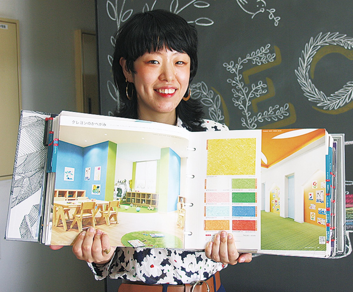 昨年1月ごろから原画づくりなどを始めたという瓶子さん。サンゲツの担当者らと協力しながら、クレヨンに似た風合いの表現などに試行錯誤を重ねた。表面硬度の向上や、優れた汚れ防止性能などにもこだわり、約半年をかけて「さくら」「たいよう」「ぱぷりか」など、計9色の壁紙を完成させた。