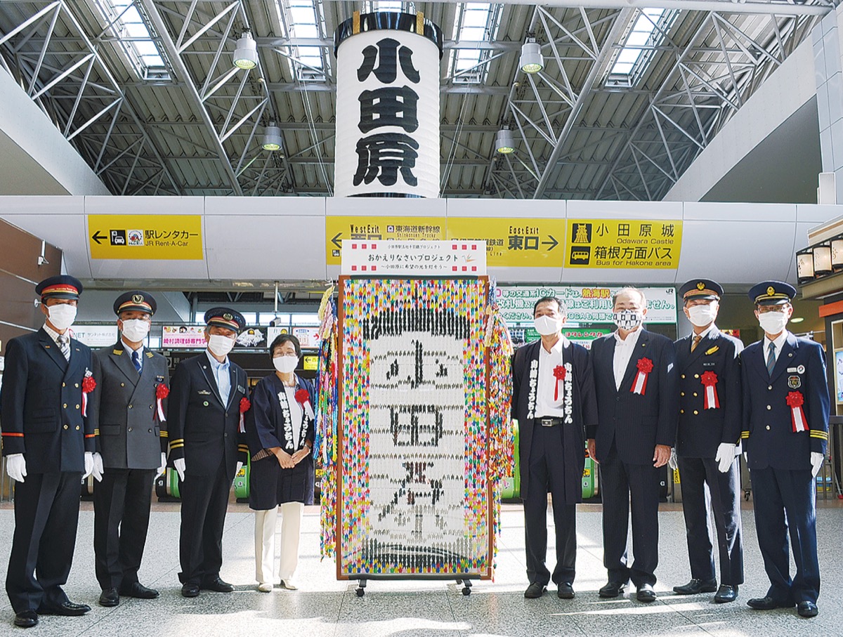 式典では守屋輝彦市長が「小田原に新しい明かりを灯すことを切に願う」とあいさつ。鉄道5社を代表して東日本旅客鉄道(株)の小野俊幸駅長は、提灯の折鶴アートについて報告し「皆様から寄せられた鶴も1万羽を越え(再掲で)バトンタッチできた」の笑みを浮かべた。この日駅を行き交う人の中には写真に収める姿も多く、構内は祝福ムードに包まれた。
