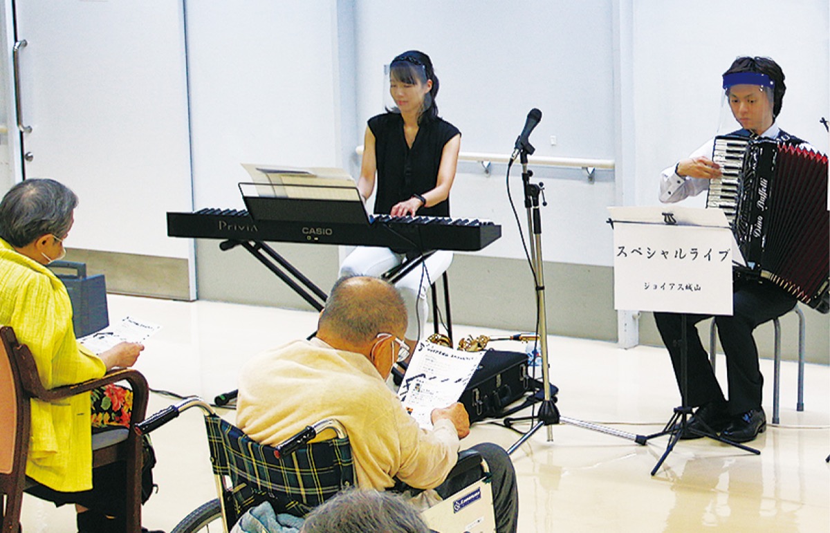 音楽療法士の資格を持つ町田大介さんと、市民オーケストラ活動にも携わる下田智美さんがテルミン、サックスなど4種の楽器を用い『上を向いて歩こう』などを披露。入所者は曲に合わせて手拍子をするなど楽しんだ。系列の崎村調理師専門学校のスペシャルランチも振舞われ、本山亮祐副施設長は「間隔確保など会場づくりに苦慮したがゆったり楽しんでいただけた。今後施設でイベントを開催する指針にもなった」と振り返った。
