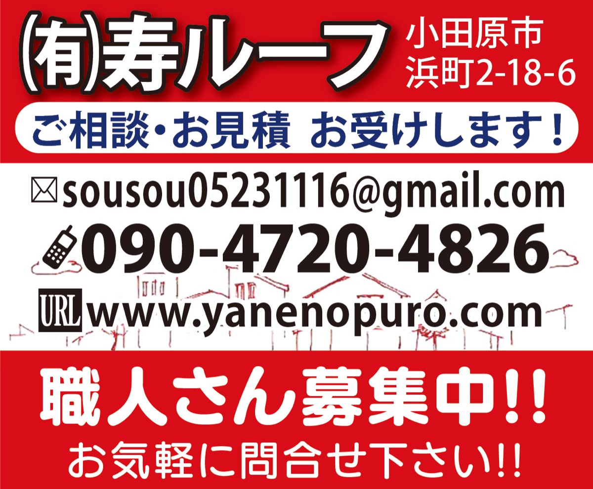 地元小田原で40年以上の実績を持つ(有)寿ルーフ(市内浜町)も問合せが増えているが「瓦の落下などは近隣の住宅や住民にも被害が及びます。また屋根の経年劣化は家屋全体の問題にも直結しますので小さな不安も気軽にご連絡を」と話す。