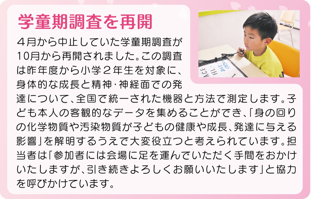 「子どもの健康と環境に関する全国調査」(エコチル調査)は、生活環境の中で触れる物質や生活習慣が、子どもの成長や病気にどう関係しているのかを調査・研究している。現在、全国15地域計約10万人の6〜9歳の子どもと両親が参加。神奈川県では小田原市、大和市、横浜市金沢区で行われている。