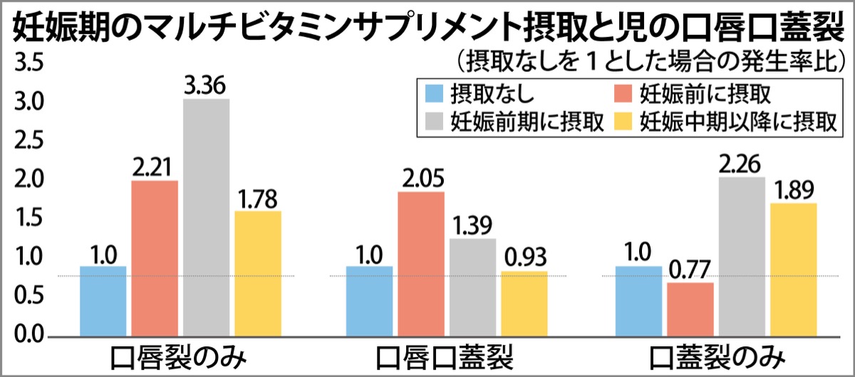 研究は2011年1月から2014年3月までにリクルートされ、エコチル調査に参加した母子ペア9万8787人を対象としました。このうち、234人が生後1か月までに口唇口蓋裂と診断されています。解析の結果、母体の食事内容は児の口唇口蓋裂と関連しなかったものの、妊娠初期のマルチビタミンサプリメント摂取は、摂取しない場合に比べて、お子さんの口唇口蓋裂発生を2〜3倍程度高める可能性があることがわかりました。