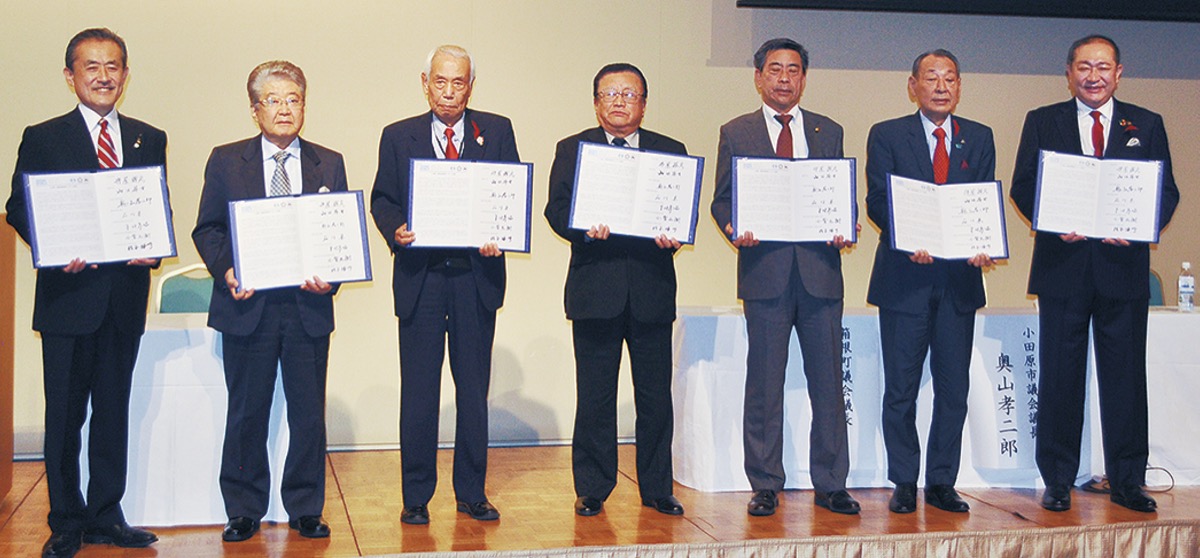 近年増加する集中豪雨や酷暑などの気候変動対策に地域が取り組むことを宣言する「小田原・箱根気候変動ワンチーム宣言」が10月27日、箱根町湯本の湯本富士屋ホテルで行われた。ワンチーム宣言に賛同した小田原箱根商工会議所(鈴木悌介会頭)、小田原市(守屋輝彦市長)、箱根町(山口昇士町長)、小田原市議会(奥山孝二郎議長)、箱根町議会(石川栄議長)、小田原市自治会総連合会(木村秀昭会長)、箱根町自治会連絡協議会(小菅元樹会長)の代表者が集い、宣言書にサインした。自治体と民間が気候変動に関する宣言をするのは全国で初めて。