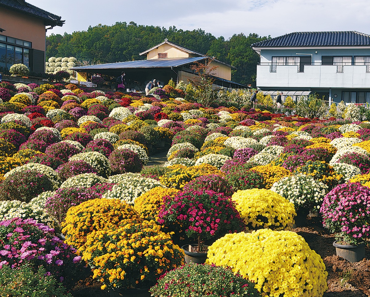 白や黄、濃淡のピンクなど色とりどりの菊は10種類ほど。30年前に栽培を始めてから徐々に数を増やし、現在は2000株以上を育てている。