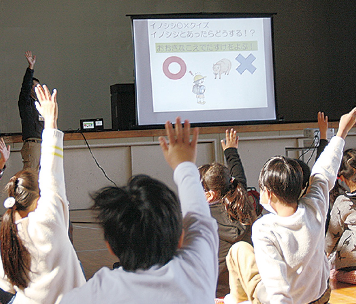 椿校長によると、同校では10月頃、帰宅中の児童が野生のイノシシを目撃するなどしたことから、県に相談。鳥獣対策を伝える特別授業への協力を打診していた。椿校長は「今年は地域の方々からの目撃例も多かった。映像や具体例などを通じ、児童にも分かりやすく対策を伝えられて良かった」と話していた。