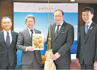 静岡県森町の太田康雄町長らが昨年末に小田原市を訪れ、治郎柿(次郎柿)の苗を守屋輝彦小田原市長に手渡した。