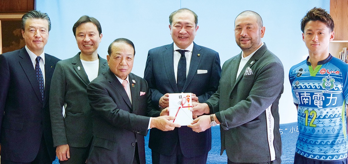 小田原市役所で行われた寄付金の贈呈式には、同クラブの古川剛士代表取締役兼CEO、鈴木博晶エグゼクティブダイレクター兼CPO、奥村敬人監督、上原拓也キャプテンが出席。守屋輝彦小田原市長が両者の橋渡し役を務めた。蓑宮さんは「ソニー退職後も楽しく前向きに過ごしてこられたのは、地元の皆さんのお陰。恩送りをしたい」とあいさつ。古川CEOは「すべてのプロスポーツの運営が難しい中、大変力になる。この地域、特に子どもたちにに明るい未来をつくっていきたい」と謝辞を述べた。寄付金は感染対策など運営費に充てられる。