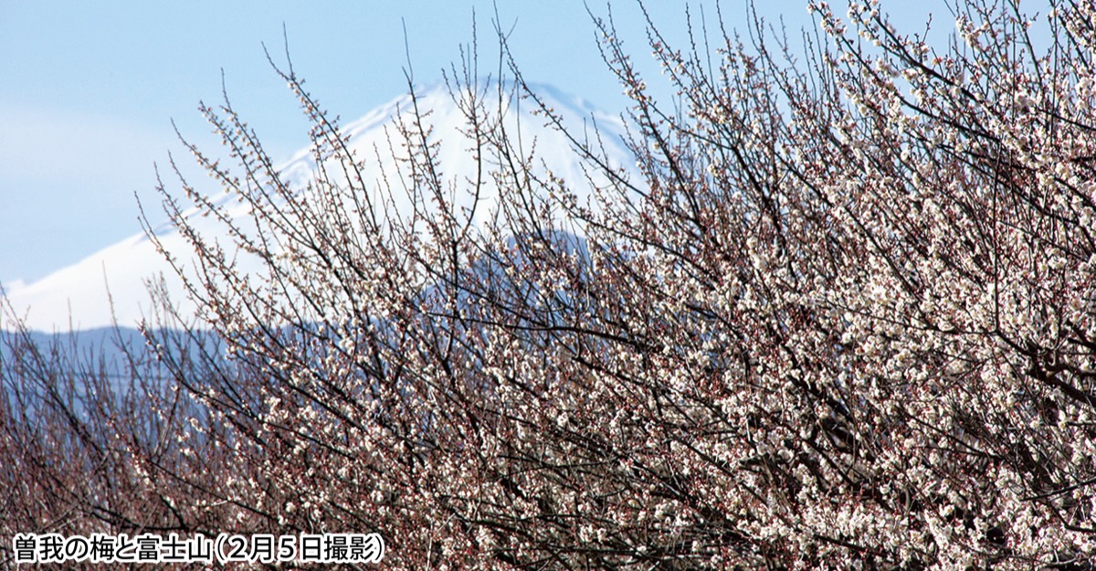 小田原市によると、関東3大梅林にも数えられる曽我梅林には、十郎や白加賀などさまざまな白梅約3万5000本が栽培されている。富士山や箱根の山々を望む背景とともに人気を博し、毎年多くの人が観梅を楽しんでいる。