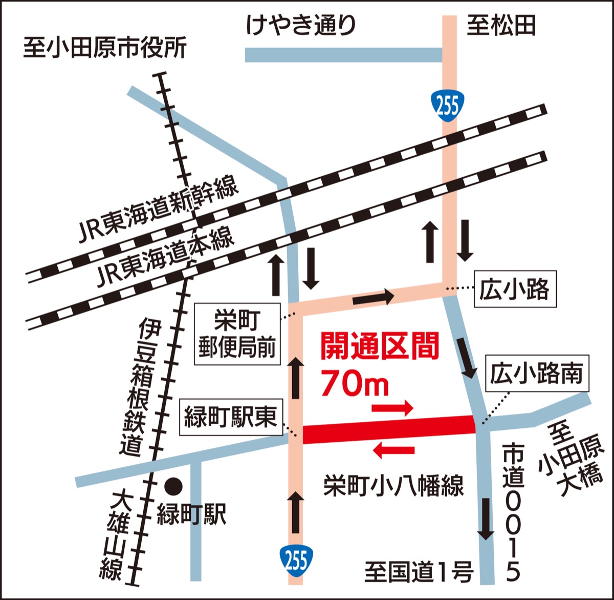 これまで小田原大橋から西へ進むと、突き当りは丁字路になっており、小田原市役所方面に進むためには大きく迂回する必要があった。新区画の完成により大幅に短縮できるようになる。緑町駅東交差点と広小路南交差点には、新たに信号機が設置されるほか、交通規制などが一部変更となる。市道水路整備課は「利用状況を踏まえ、現在一方通行道路の広小路交差点と広小路南交差点間の相互通行化なども今後検討していきたい」と話している。