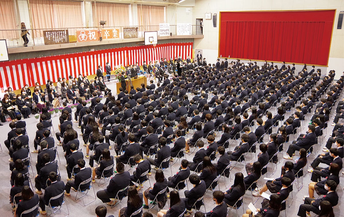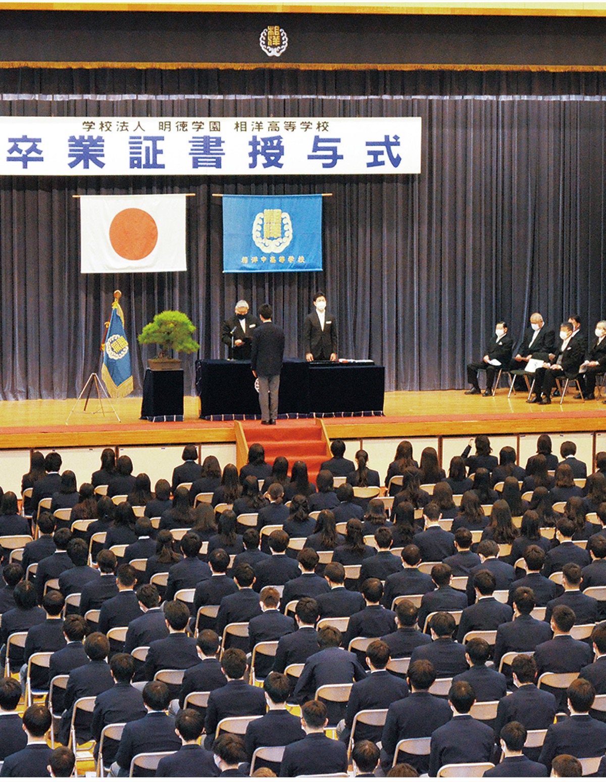 学校法人明徳学園相洋高校(杉崎朗校長)では、417人が新たな巣立ちを迎えた。生徒、教諭らはマスク着用、会場校内の換気など新型コロナ感染症対策を行い式典に臨んだ。杉崎校長は「一つひとつの経験を大切にして歩を進めてください。生きていく上で無駄な経験はありません」と卒業生に言葉を贈った。その後、杉崎校長から代表生徒に卒業証書が渡された。