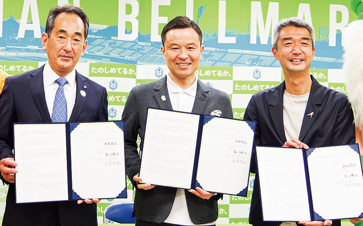 13日の締結式には(株)湘南ベルマーレ、同フットサルクラブを運営する(株)小田原スポーツマーケティング、日本郵便(株)県西部地区連絡会の関係者が出席。がん啓発や青少年育成などの協力内容が発表された。