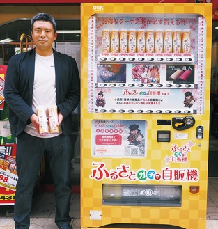 紙器・紙加工品などの製造を手掛ける小田原紙器工業株式会社(小田原市久野/高橋康徳社長)が4月5日、小田原や箱根などの県西の名産品が当たる自動販売機「ふるさとガチャ自販機」をドン・キホーテ小田原店に設置した。新型コロナウイルスにより売り上げが低迷する地元企業の販路支援が目的だ。