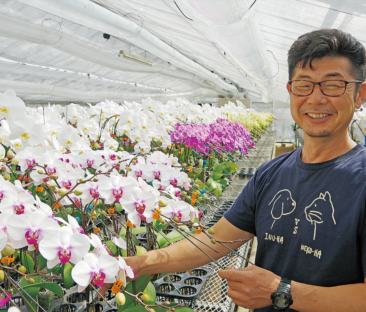 温室内の多くは白色だが、ピンクに加え最近人気の黄色いコチョウランも並ぶ。「今シーズンはLED機器を導入して照射調整を丁寧に行ったので良い花が多い」と話すのは神谷淳一代表(56)。コチョウランの観賞期間は1カ月ほどだが「環境によって2カ月以上持つこともありますので、大切に育ててほしい」と話している。