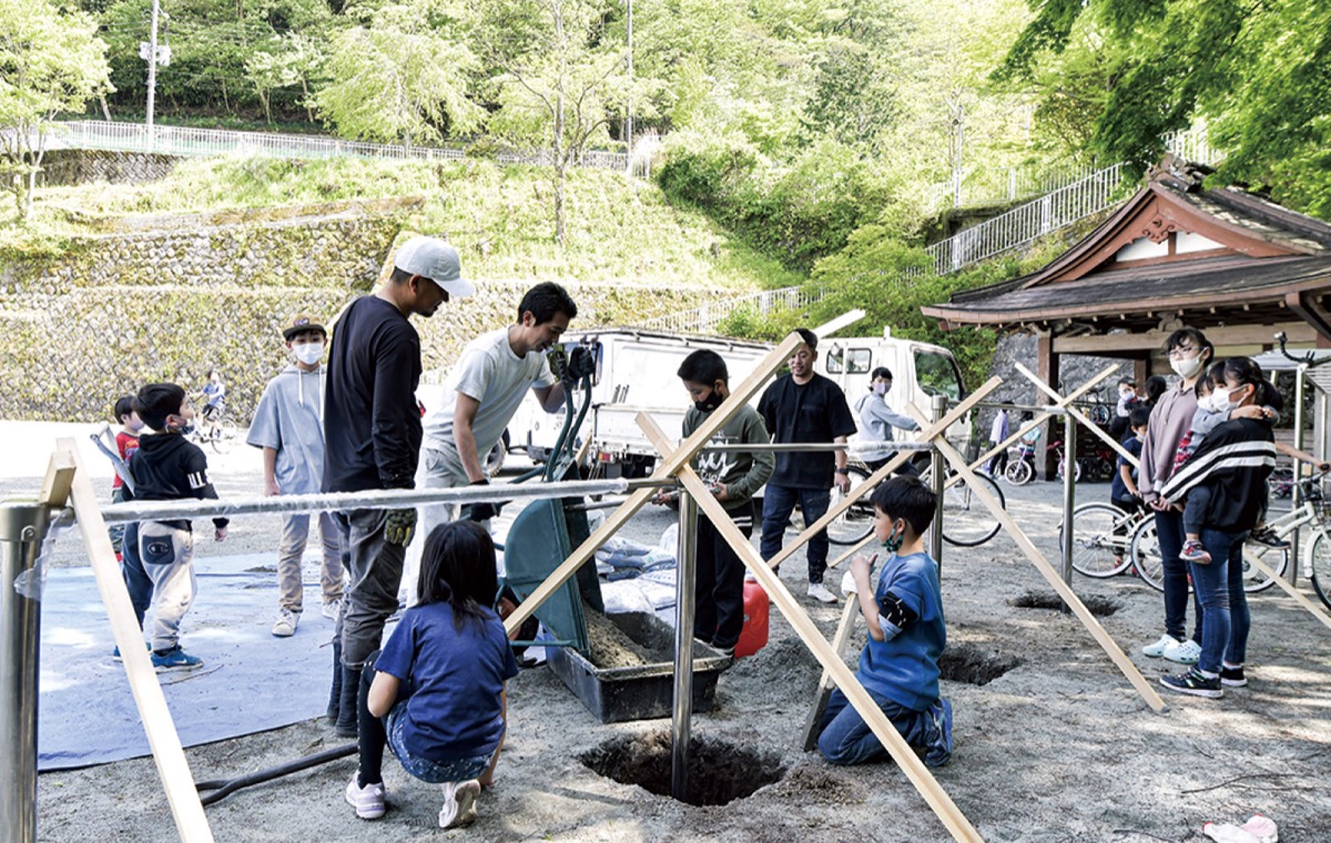 5月9日には自転車や一輪車が学園に届けられたほか、建築業を営む伊藤さん自ら鉄棒の設置を施工。一緒に現地を訪れた伊藤さんの子どもや学園の子どもたちも手伝い、楽しそうに汗を流し作業を行った。