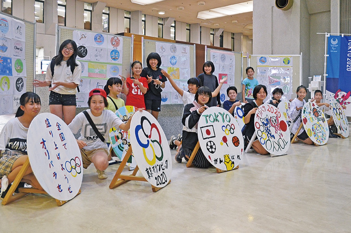 飾り付けには15人の児童が参加した。5色の輪や「TOKYO」「2020」「がんばれ」などの文字、日の丸などを描いた円形パネルは全部で10枚、さらに水泳やテニス、車いすテニス、柔道、ボッチャなど競技の絵が一面に掲示されている。児童は「文字や絵のバランスをとるのが難しかった」など制作時を振り返りながら笑顔で飾り付けていた。展示はパラリンピックが閉会する9月5日(日)まで。