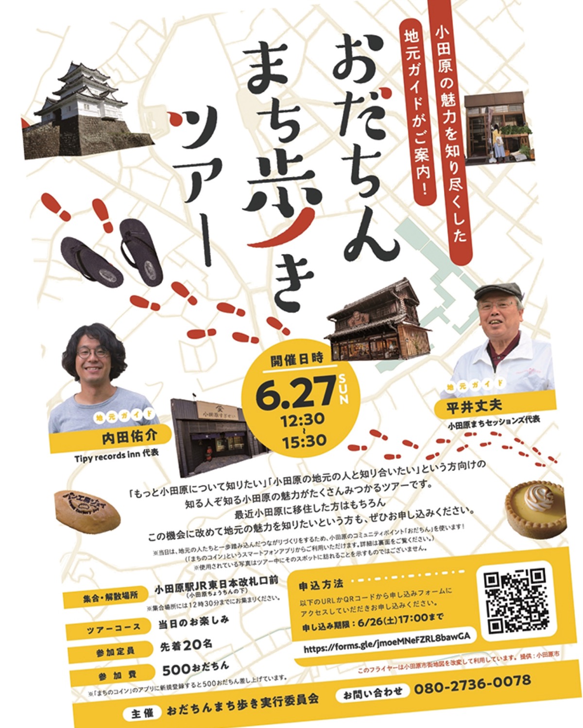 ガイドは、平井丈夫さん(小田原まちセッションズ代表)と内田佑介さん(Tipy records inn代表)が務める。コースは当日まで非公表で、「最近小田原に移住した方、あらためて地元の魅力を知りたいという方もぜひ」と呼び掛けている。定員は申込先着順20人。参加希望者は申し込みフォーム(https://forms.gle/jmoeMNeFZRL8bawGAまたは二次元コード)から。申込期限6月26日(土)午後5時。(問)実行委員会【電話】080・2736・0078
