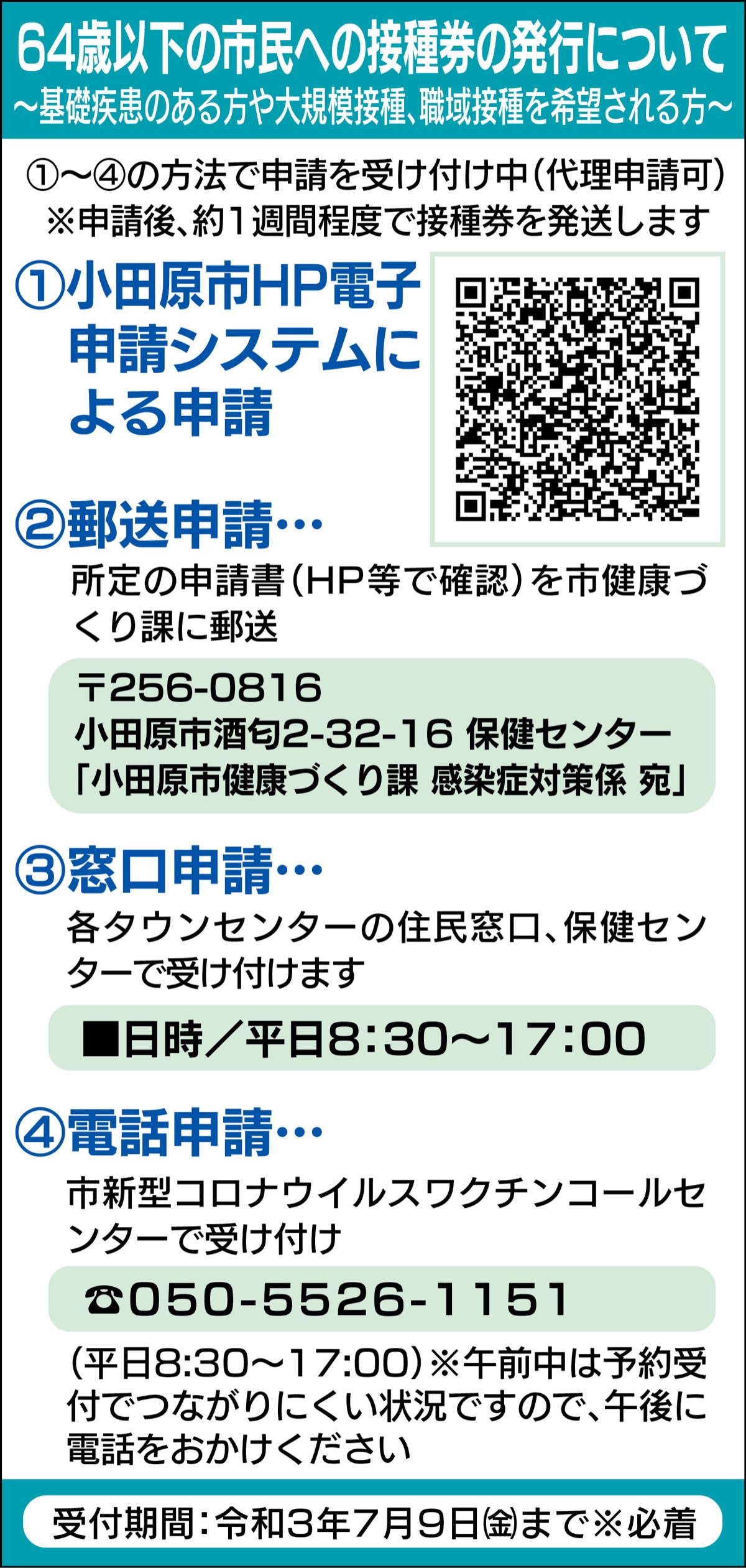 市は64歳以下の市民で条件に該当する希望者へワクチン接種券の先行受付を開始。基礎疾患がある人や大規模接種、職域接種を希望する人が対象。申請は7月9日(金)まで、【1】市HPの電子申請システム、【2】郵送申請、【3】窓口申請、【4】電話申請で受け付けている。※申請をしない人については年齢ごとに7月中旬から接種券を順次発送予定。申請方法などは、市の広報紙7月号やHP(https://www. city.odawara.kanagawa.jp/ ) などから確認できる。